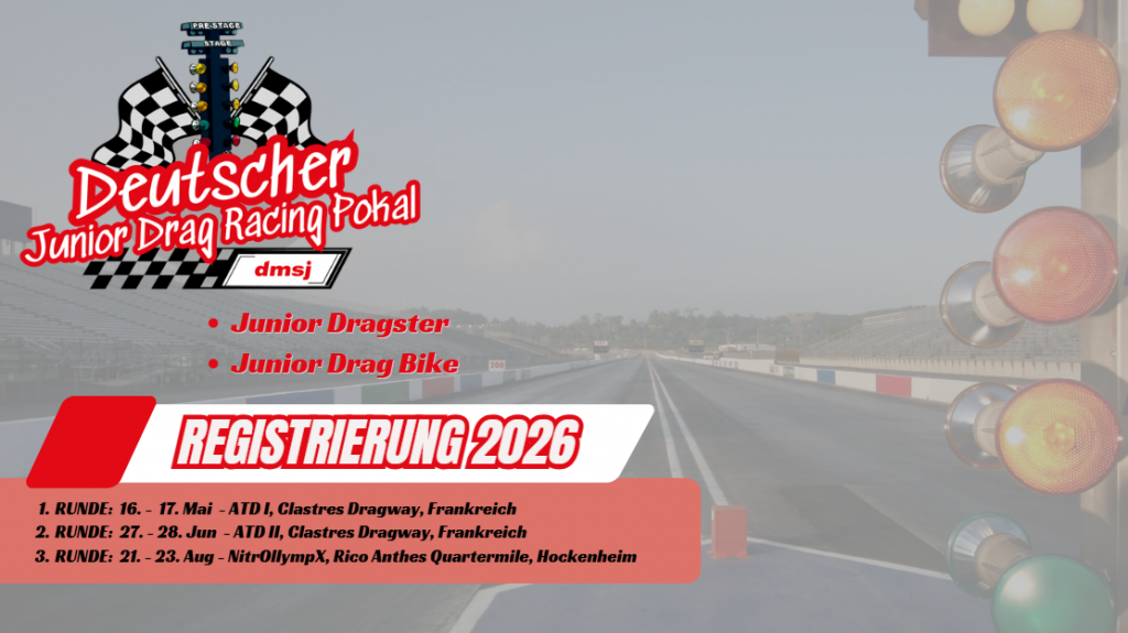 Kinder und Jugendliche im Alter von 8 bis 18 Jahre die mindestens eine Nationale Lizenz Stufe C* des DMSB oder eines anderen der FIA angeschlossenen ASN besitzen, können sich für den JDRP –Deutscher Junior Drag Racing Pokal 2026 registrieren, entsprechend der aktuellen DMSB-Prädikats- und Lizenzbestimmungen.
